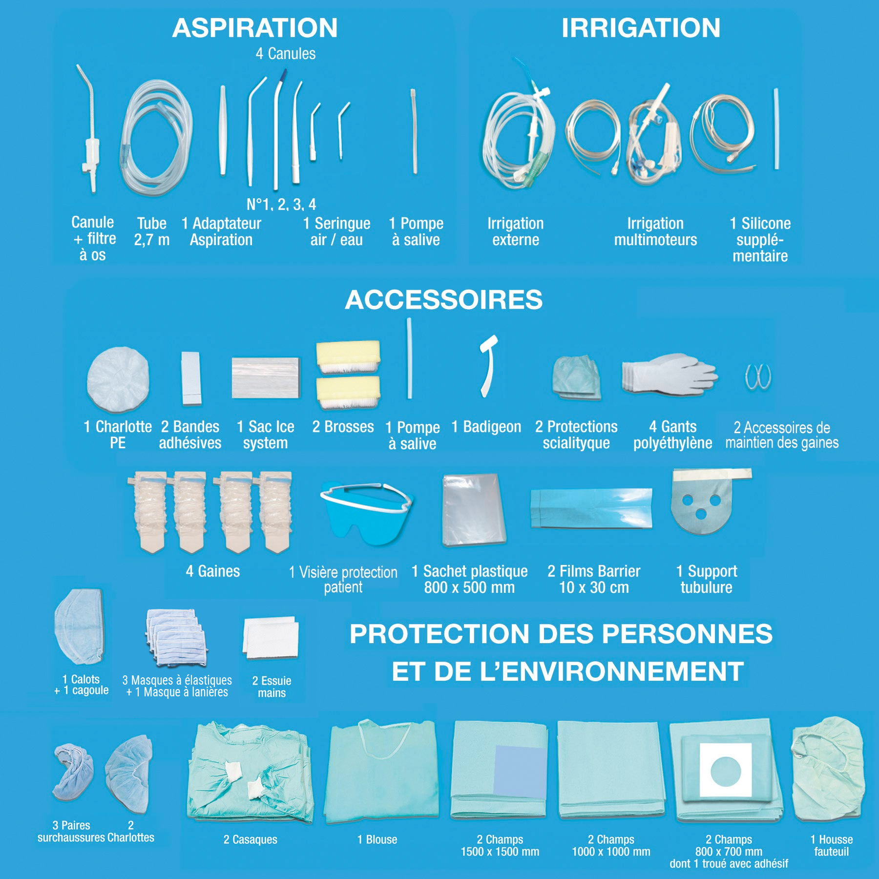 IV. | PROTECTION DES PERSONNES ET DE L'ENVIRONNEMENT - 1 MuÌ?tze + 1 Haube - 3 Maske - 3 Überschuhe - 2 Barett-Haube - 2 Handtuch - 1 Housse pour fauteuil - 2 Chirurgen-Kasack, GröÃ?e L, SMMS - 1 SMMS-Kittel - 2 Abdecktuch 1500 mm x 1500 mm - 2 Abdecktuch 1000 mm x 1000 mm - 2 Lochtuch 800 x 700 mm, in der Mitte verklebbar |
