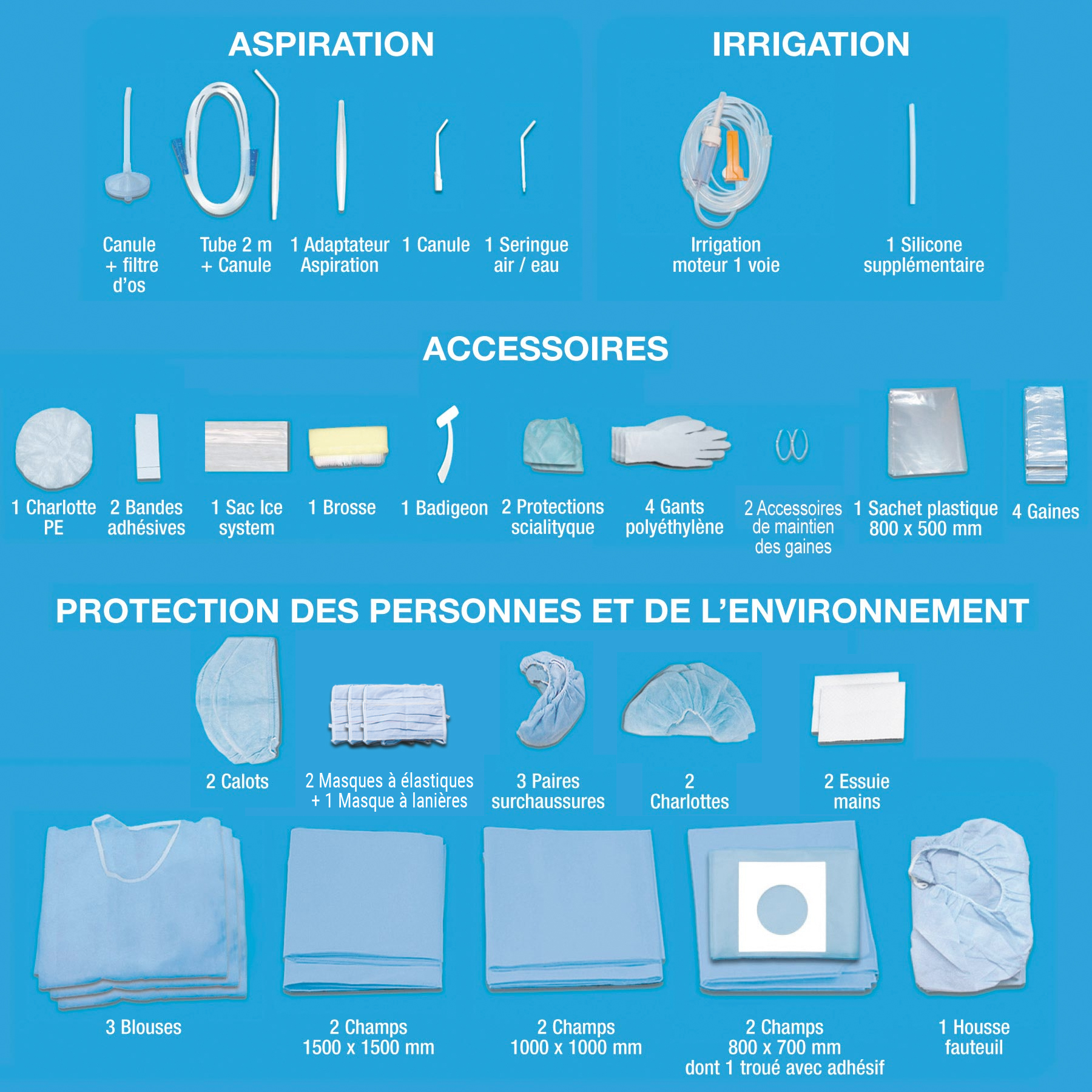 PROTECTION DES PERSONNES ET DE L'ENVIRONNEMENT - 2 MuÌ?tze - 2 Maske - 3 Überschuhe - 2 Barett-Haube - 2 Handtuch - 3 Isolierkittel - 2 Abdecktuch 1500 mm x 1500 mm + an einer Seite verklebbar - 2 Abdecktuch 1000 mm x 1000 mm + an einer Seite verklebbar - 2 Lochtuch 800 x 700 mm - 1 Elastischer Überzug 1900 x 1050 mm