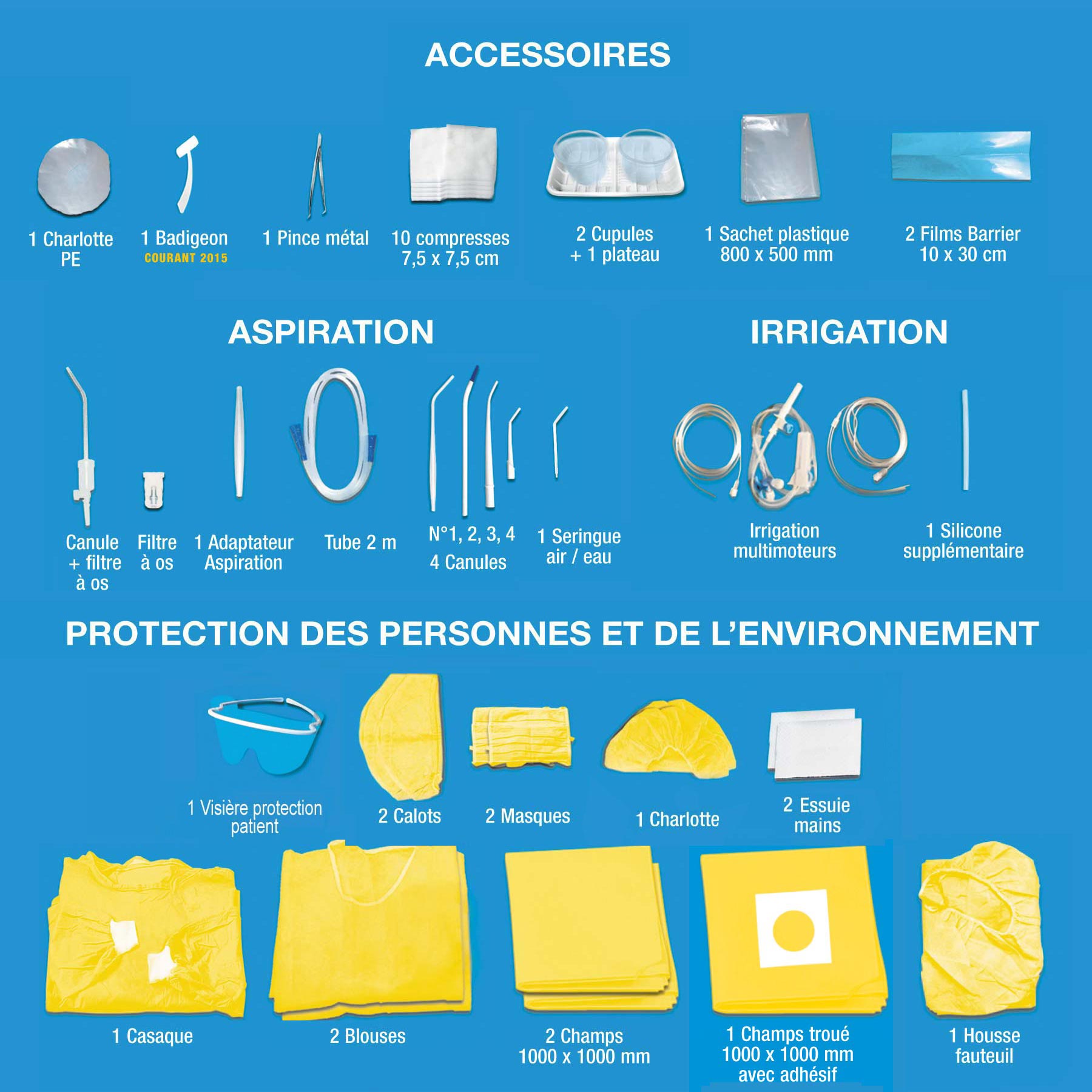 3. | ACCESSOIRES - 1 charlotte PE - 1 badigeon (dispo courant 2015) - 1 pince en métal - 10 compresses 7,5 x7,5 cm - 2 cupules + 1 plateau - 1 visière - 1 sachet plastique 800x500 mm - 2 films Barrier |