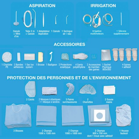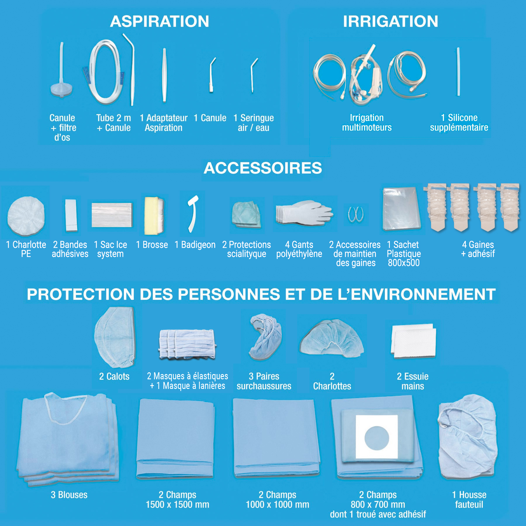 | IV. | PROTECTION DES PERSONNES ET DE L'ENVIRONNEMENT - 2 Doctor's cap - 2 Mask - 3 Overshoes - 2 Bouffant cap - 2 Hands towel - 3 Barrier gown - 2 Drape 1500 mm x 1500 mm + adhesive side - 2 Drape 1000 mm x 1000 mm + adhesive side - 2 Slipe drape 800 mm x 700 mm - 1 Elastic chair cover 1900 x 1050 mm |