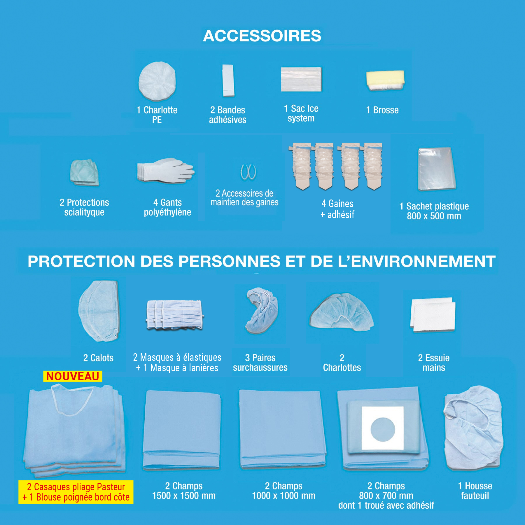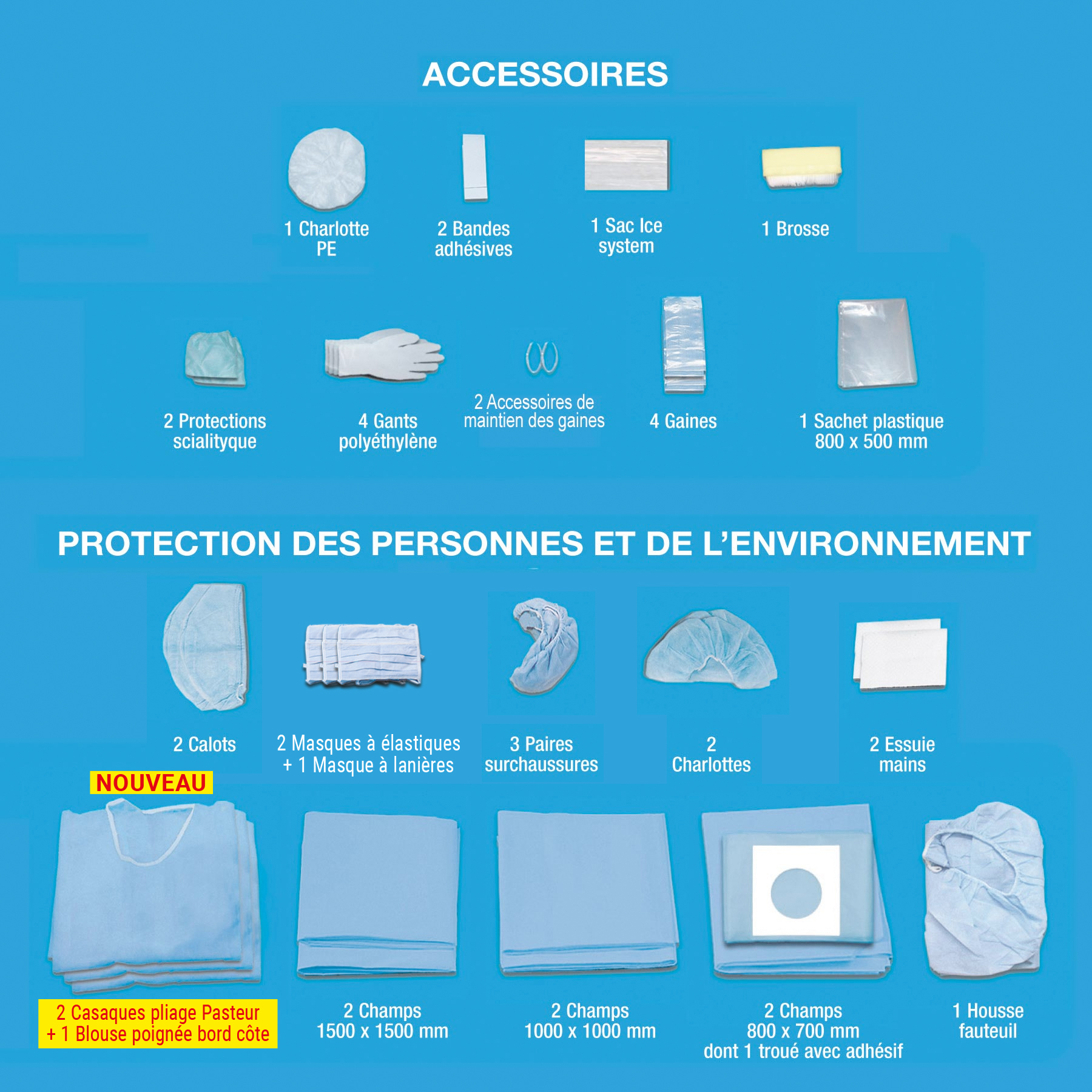 | II. | PROTECTION DES PERSONNES ET DE L'ENVIRONNEMENT - 2 Calots - 2 Masques à élastiques + 1 Masque à Lanières - 3 Paires de surchaussures - 2 Charlottes - 2 Essuie mains - 2 Casaques pliage Pasteur + 1 Blouse poignée bord côte - 2 Champs 1500x1500 mm - 2 Champs 1000x1000 mm - 2 Champ troué 800 mm x 700 mm dont 1 avec adhésif - 1 Housse pour fauteuil