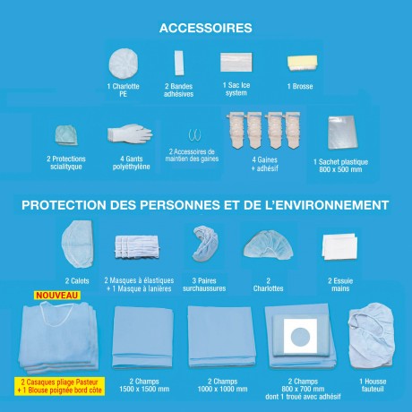 | I. | ACCESSOIRES - 1 Charlotte pour tube radio - 2 Bande adhésive 700 x 50 mm - 1 Sachet Ice System - 1 Brosse - 2 Protège poignée de scialytique - 4 Gant Polyéthylène - 2 Accessoires de maintien des gaines - 4 Gaines plastique 1200 x 80 mm - 1 Sachet plastique 800 x 500 mm |