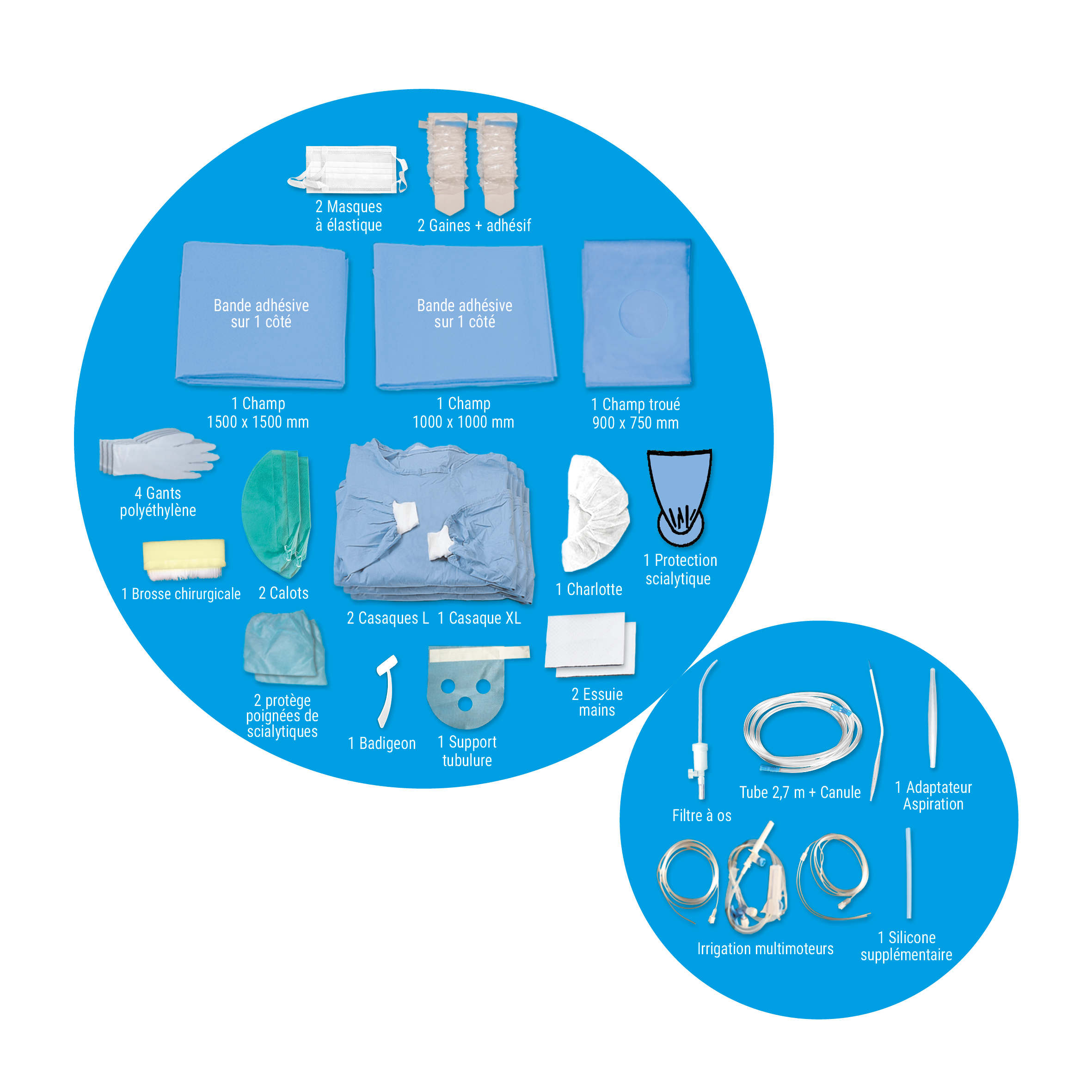 II. | COMPOSANTS TUBING 2 VOIES - 1 Filtre à os - 1 Tube 2,7 mm - 1 Canule - 1 Adaptateur Aspiration - 3 Irrigations multimoteurs - 1 Silicone supplémentaire |