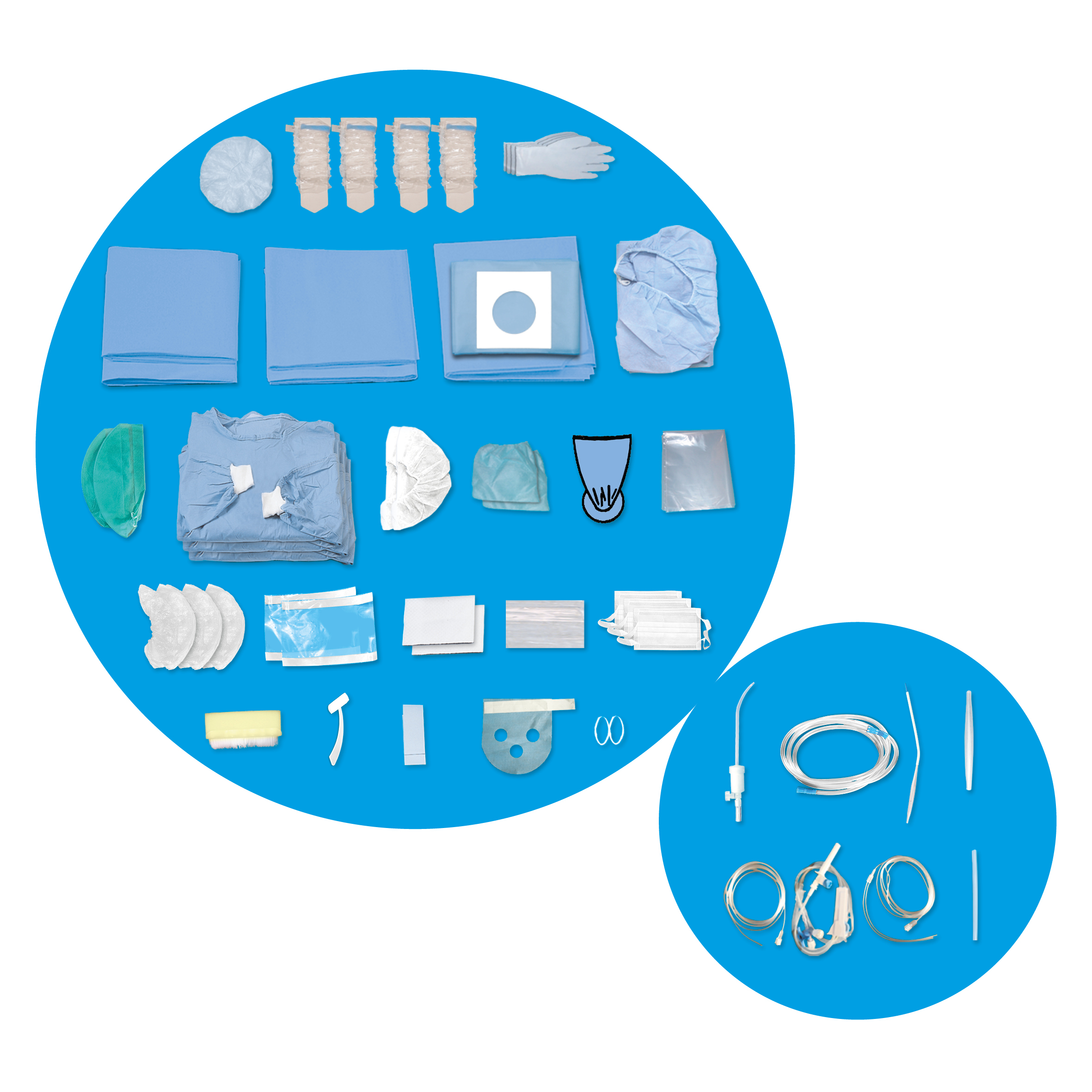 - 1 Charlotte PE - 4 Gants polye?thyle?ne - 4 Gaines + adhésif - 2 Bandes adhe?sives - 2 Champs 1500 x 1500 mm (Bande adhe?sive sur 1 co?te?) - 2 Champs 1000 x 1000 mm (Bande adhe?sive sur 1 co?te) - 2 Champs 800 x 700 mm dont (Dont 1 troue? avec adhe?sif) - 1 Housse fauteuil - 1 Brosse chiurgicale - 1 Badigeon - 1 Calot - 1 Cagoule - 2 Casaques L - 1 Casaque XL - 2 Charlottes - 2 Prote?ge poigne?es de scialytiques - 1 Protection scialytique - 1 Sachet plastique 800 x 500 mm - 3 Paires surchaussures PE - 2 Protections clavier avec adhe?sif - 2 Essuie-mains - 1 Sachet Ice system - 3 Masques a? e?lastique - 2 Bandes adhe?sives - 1 Support tubulure - 2 Accessoires de maintien des gaines
