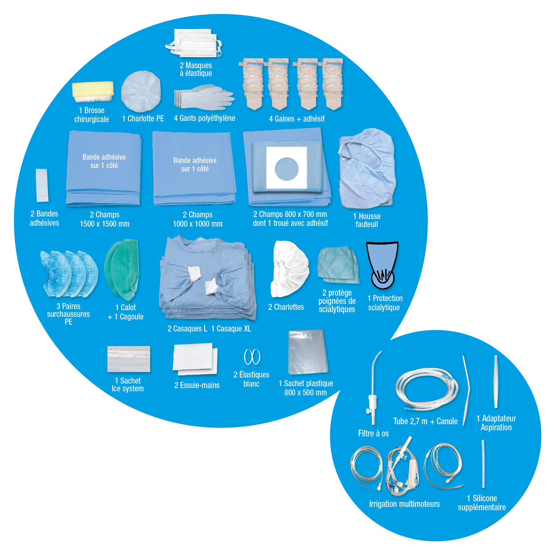 I. | COMPOSANTS DU KIT - 2 Masques à élastique - 1 Brosse chiurgicale - 1 Charlotte PE - 4 Gants polye?thyle?ne - 4 Gaines + adhésif - 2 Bandes adhe?sives - 2 Champs 1500 x 1500 mm (Bande adhe?sive sur 1 co?te?) - 2 Champs 1000 x 1000 mm (Bande adhe?sive sur 1 co?te) - 2 Champs 800 x 700 mm dont (Dont 1 troue? avec adhe?sif) - 1 Housse fauteuil - 3 Paires surchaussures PE - 1 Calot - 1 Cagoule - 2 Casaques L 1 Casaque XL - 2 Charlottes - 2 Prote?ge poigne?es de scialytiques - 1 Protection scialytique - 1 Sachet Ice system - 1 Essuie-mains - 1 Accessoires de maintien des gaines - 1 Sachet plastique 800 x 500 mm