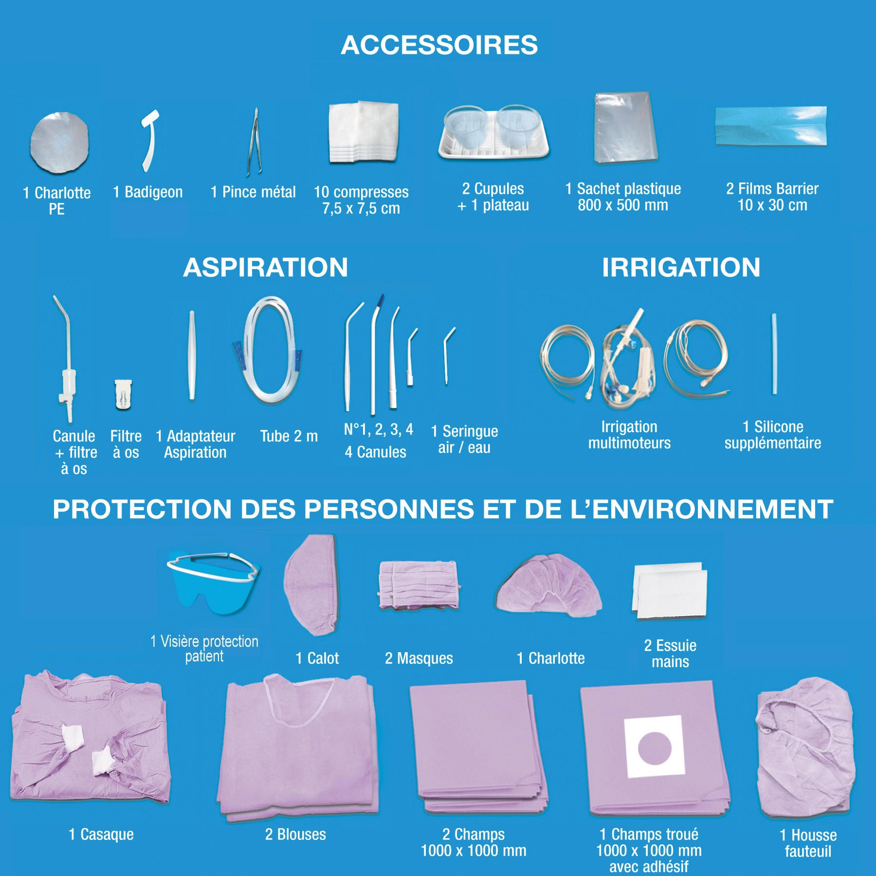 IV. | PROTECTION DES PERSONNES ET DE L'ENVIRONNEMENT - Calotta (1) - Maschera (2) - Cuffia per amplificatore di brillantezza (Protezione del tubo radiografico)(1) - Asciugamani (1) - Casacca - 2 Champs 1000x1000 mm - 1 Champs troués 1000x1000 mm avec adhésif - 1 Housse pour fauteuil
